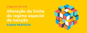 Artigo 53.º do CIVA – Alteração do limite do regime especial de isenção 05 Jan 2023 admin Uncategorized No comment A Lei do Orçamento do Estado para 2023 prevê a alteração do limite de aplicação do regime especial de isenção do artigo 53.º do CIVA, sendo essa alteração progressiva até atingir 15.000 euros.